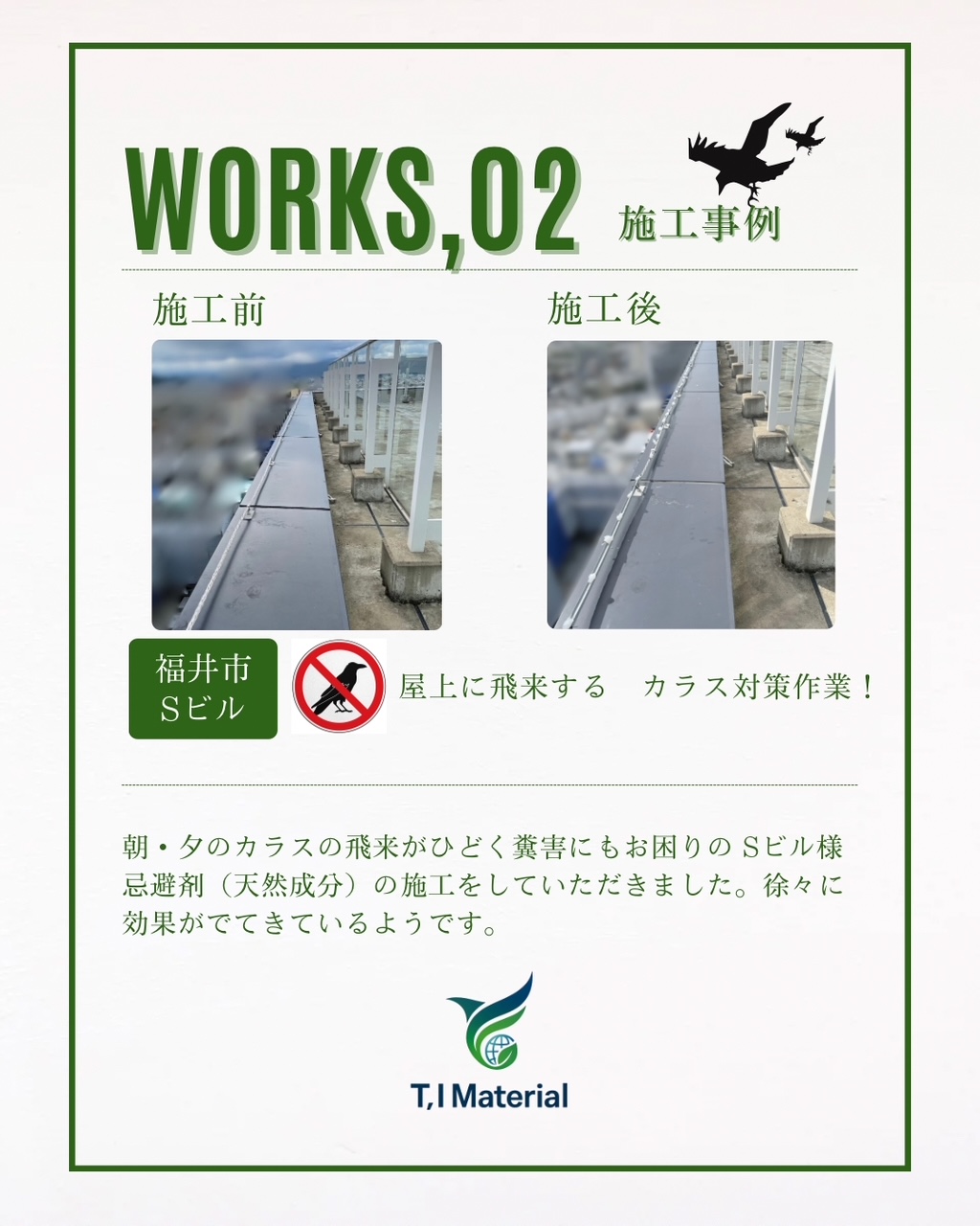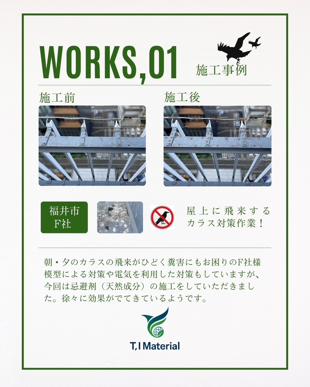 T,I materialでは、公共施設・企業・ご家庭を対象とした「鳥獣害防止サービス(忌避剤の販売・施工)」も展開し、日々の暮らしや事業活動の中での快適な環境づくりに貢献しています。